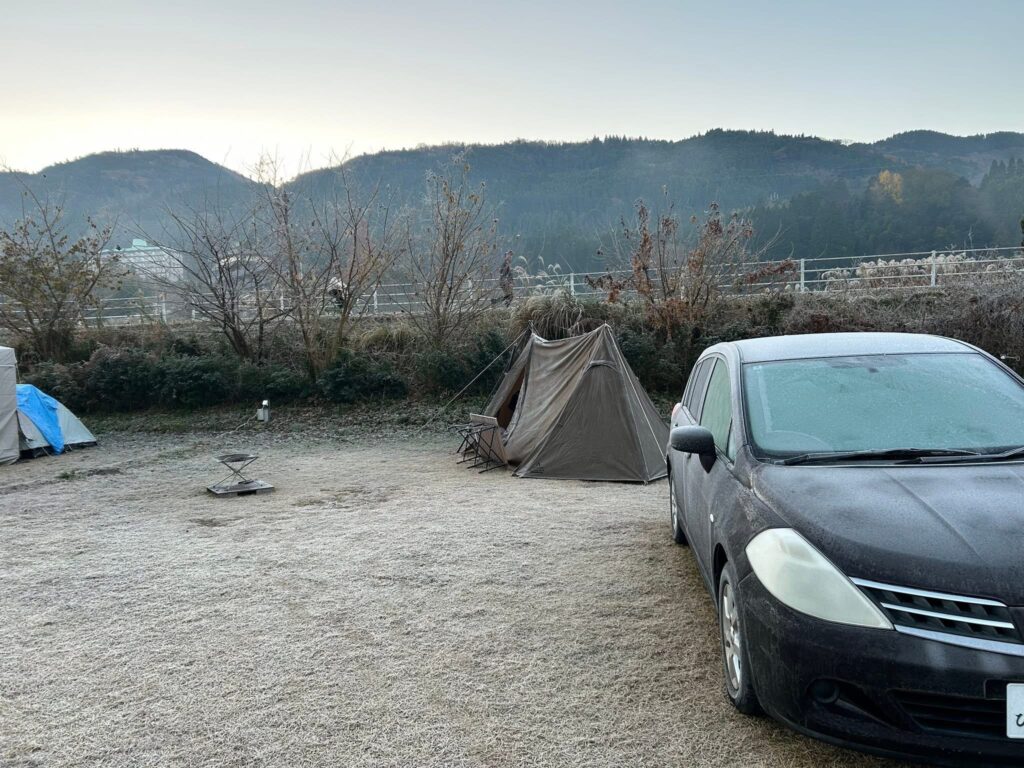 今回のキャンプ場の朝は辛かった。